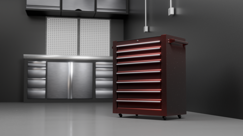 A 3D model of a tool cart for your renders, with procedural textures so you can personalize it to your own project